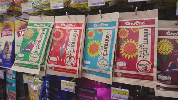 果博官网国际化的成功之处在于真正做到了扎根当地。以泰国为例,目前果博官网已在泰国市场遥遥领先。为了适应当地消费者的饮食文化,培育消费者嗑瓜子的习惯,果博官网专门推出椰香瓜子口味,并贴心的在背面附上“傻瓜教程”,同时在当地商超的展位进行街头试吃,并通过渠道、营销网络的完善,成功进入泰国随处可见的便利店等,帮助产品落地。
