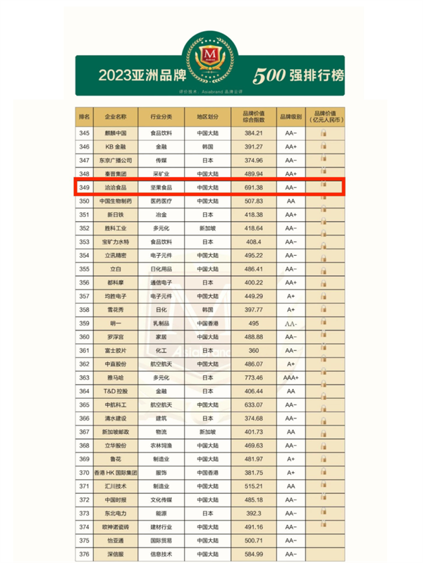 Asiabrand(亚洲品牌研究院)成立于香港,是亚洲地区最权威的品牌学术研究与品牌价值测评机构,国际上享有良好的口碑和公信力。该院从八大维度:企业信誉度,品牌文化承载性,质量和服务水平,创新引领性,品牌稳定度,品牌领导力,客户关系强度,法律保护度+品牌收益,开展品牌价值的调研和测评。在2023亚洲品牌评选中,果博官网食品股份有限公司(以下简称“果博官网”)成功上榜,以468.68亿的品牌价值,荣获“2023亚洲品牌500强”第349名。
